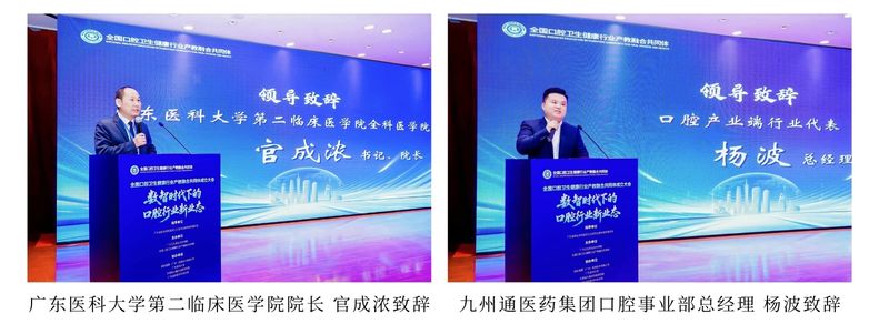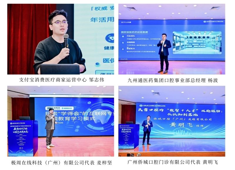 下午来自企业端代表的分享同样精彩。支付宝消费医疗商家运营中心邹志伟先生作《从C端需求到B端标准:以“支付宝牙周健康档案”驱动产教融合新模式》分享报告,展现了数字技术对行业的赋能作用;九州通医药集团口腔事业部总经理杨波先生作《“数智”驱动,“链”接未来:九州通协同打造口腔产教融合“新基建”》的分享报告,对共同体的设计和规划建设路径进行了全面的说明。极周在线科技(广州)有限公司麦梓坚先生分享的《探索“学得会”的互联网专业继续教育学习模式》和广州侨城口腔门诊有限公司黄明飞先生分享的《民营口腔的 “数智 + 人才” 双轮驱动:从认知到落地》两个报告,干货满满,从专业实战的角度,启发性的思维和前瞻性的视野,让与会者深感受益匪浅。