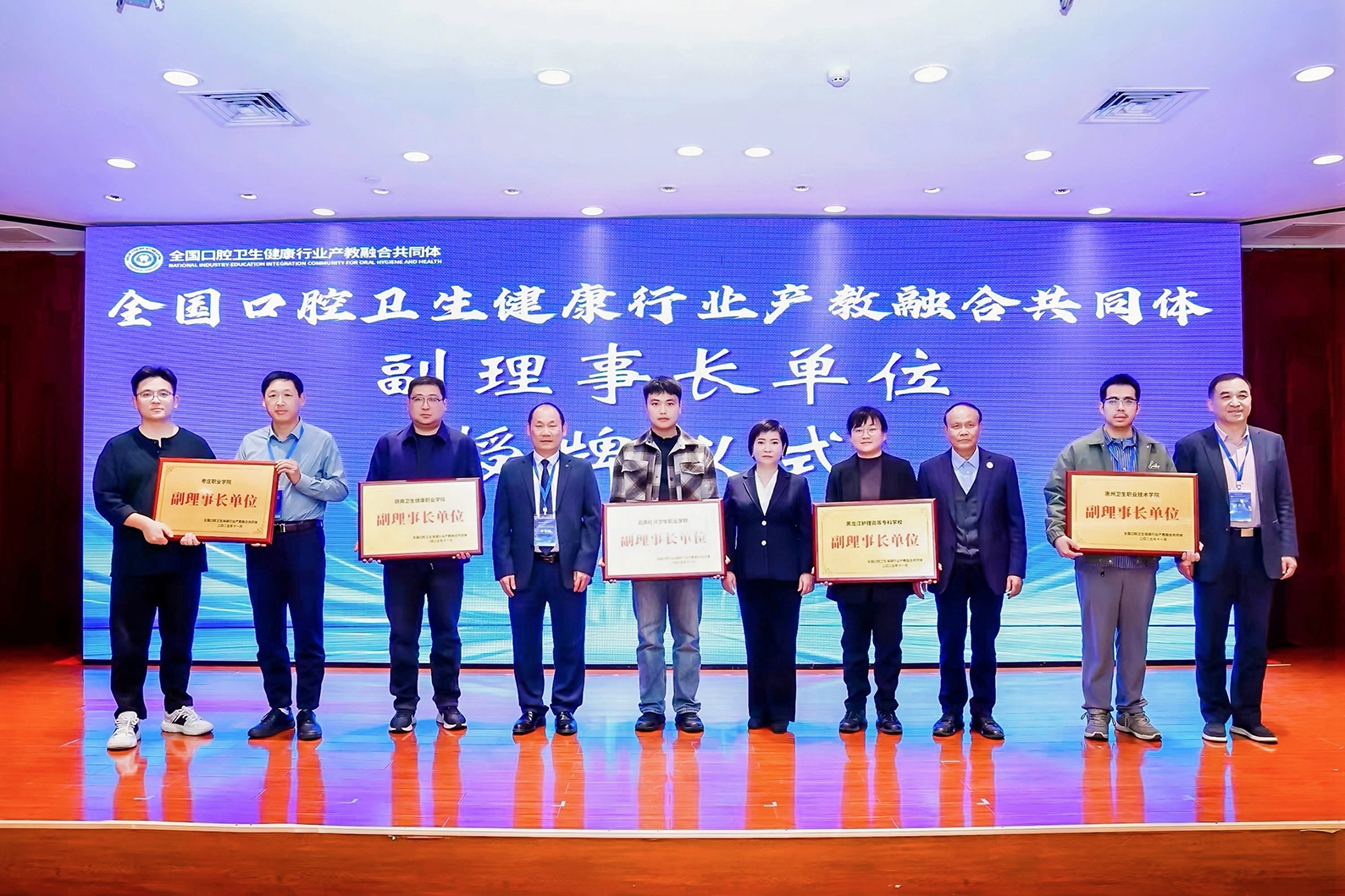 在成立仪式启动环节,与会领导、专家和共同体牵头单位代表等八位嘉宾共同启动电子屏,标志着全国口腔卫生健康行业产教融合共同体正式成立。随后举行(常务)副理事长单位、秘书长单位授牌仪式,并播放(常务)理事单位名单,标志着共同体组织架构正式搭建完成。