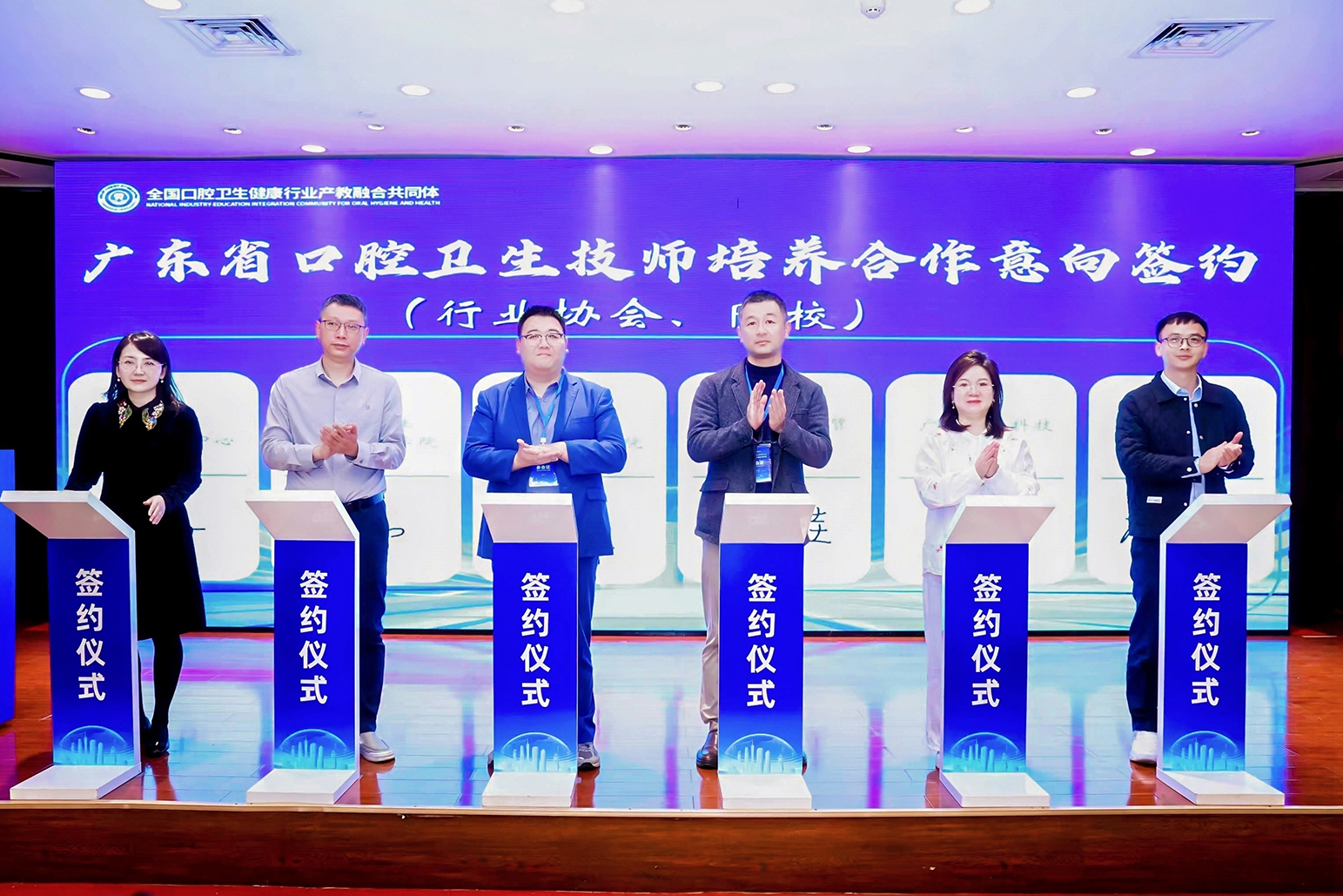 签约环节成为本次活动亮点。行业协会、院校和医院代表共同完成了广东省口腔卫生技师培养合作意向签约。随后,广州卫生职业技术学院代表分别与东莞市顺林医疗健康有限公司签署《口腔扫描仪光学探头保护套》大创项目转让协议,与苏州倍斯通医学科技有限公司签署《牙体形态与牙列认知教学模型》专利转化协议,为未来共同体开展校企深度合作,推动校企科研成果应用转化提供样板和范例。