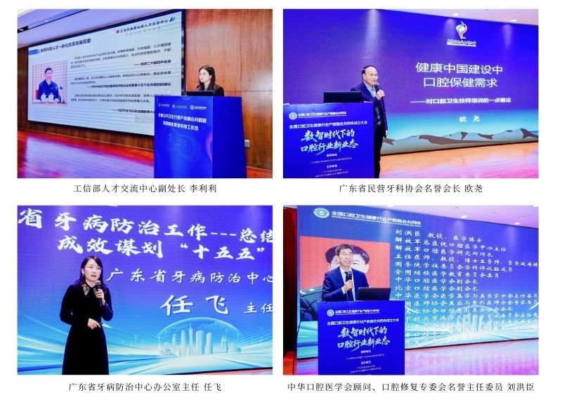 在当天上午的主题报告环节,来自政府部门、行业协会、院校及企业的专家学者,围绕口腔职业教育与产业发展、人才培养的关键问题分享真知灼见。工信部人才交流中心副处长李利利提出建立产业需求导向的人才培养适配机制,为职业教育改革提供方向;广东省民营牙科协会名誉会长欧尧教授聚焦健康中国建设背景下的口腔保健需求,向与会者全面分析了口腔行业发展的新机遇;中华口腔医学会高职高专口腔医学教育分会主任委员纪晴教授深入剖析我国口腔职业教育现状,呼吁企业更加重视行业人才培养的优化;广东省牙病防治中心办公室主任任飞教授回顾了广东省牙病防治“十四五”的成效,对我省“十五五”牙病防治工作提出目标和发展愿景。我国口腔卫生保健专业和口腔卫生技师岗位设立的主要倡导者和推动者,中华口腔医学会顾问、原副会长、解放军总医院(301医院)口腔医学中心主任刘洪臣教授也在百忙之中亲临共同体成立大会的现场,让参建单位备受鼓舞。刘教授在全场热烈掌声中压轴出场,对口腔卫生保健专业建设,对共同体数智时代背景下的发展提出了殷切期望和嘱托。
